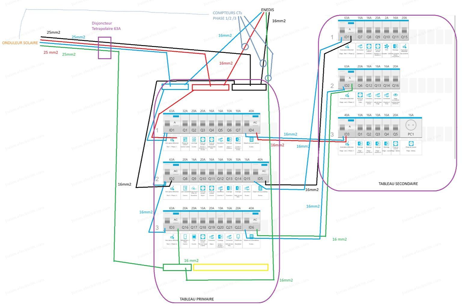 - N°13356 : Bonjour, J'ai fait un schéma de mon futur tableau alimenté par un DB 30A. J'aurais besoin d'avis pour savoir si il fonctionnera correctement et en toute sécurité. J'ai essayé de répartir la consommation sur chaque phase...