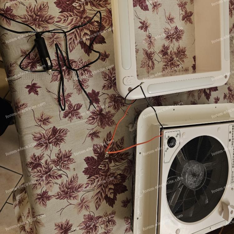 Pour le branchement j'ai procédé de la sorte (photo 1) j'ai relié les deux fil dénudés du ventilateur au deux fils dénudés de la lumière led.