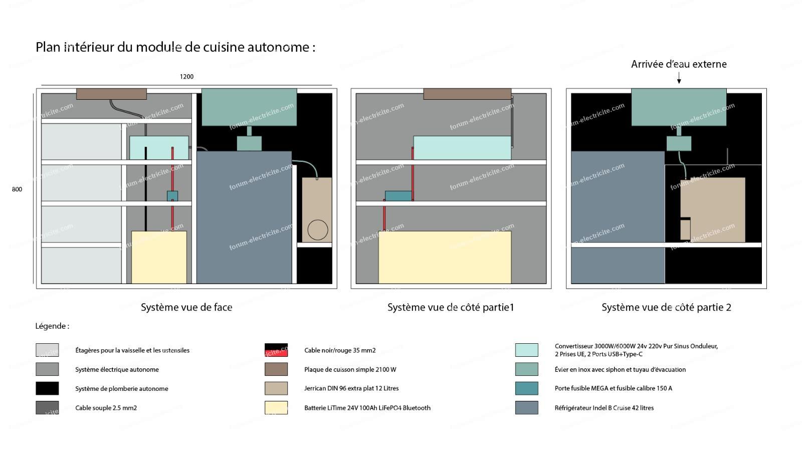 Mon objectif avec cette cuisine mobile c’est de pouvoir utiliser un frigo qui fonctionne avec un compresseur pour qu’il puisse refroidir en 15 minutes sans qu’il ne consomme de trop (son utilisation ensuite serait prolonger pendant 2 à 3h le temps du déplacement et de la cuisine)(environ 45W pour la cuisine peut être un peu plus au démarrage) pour la plaque de cuisson j’opte pour un emplacement simple avec 2100 W de puissance max, 2 emplacements auraient été beaucoup trop énergivore.