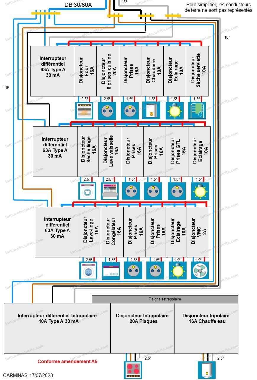 Je suis parti sur un tableau 4 rangées, au vu du nombre de circuits, mais le dimensionnement des différentiels et l'équilibrage sont un mystère pour moi.